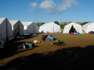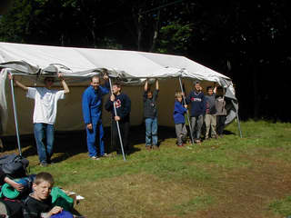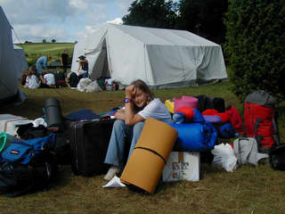Der Abbau Der Wettergott ist uns am Abbautag hold. Obwohl die Wolken immer wieder Regen verheißen, können alle Zelte trocken abgebaut und verladen werden - sie müssen nicht mehr in Darmstadt aufgebaut werden. Die Rückreise verläuft reibungslos. Pünktlich um 17.00 Uhr kommen die Busse in Darmstadt und Groß-Gerau an. Viele Freundschaften sind neu geschlossen, viele vertieft. Erlebnisreiche und nicht immer nur schöne zwei Wochen liegen hinter den Teilnehmern und dem Team. Trotz des vielen Regens hat das Team immer ein ansprechendes Programm anbieten können und es den Witterungsbedingungen flexibel angepasst. Die hohe Belastung wurde routiniert gemeistert, obwohl ein verhältnismäßig großer Teil des Teams das erste Mal in der Rolle des Betreuers war. Interessanter Weise war die Quote der Arztbesuche relativ gering. Der letzte Lob geht an die 120 Teilnehmer, also an Euch. Ihr habt nicht nur das schlechte Wetter so genommen, wie man es nehmen sollte - als gottgegeben, sondern das Zeltlager wieder einmal zu dem gemacht, was es sein sollte: 14 Tage, Spiel, Spaß und Spannung. Und hier die letzten Bilder des Zeltlagers 2002: |