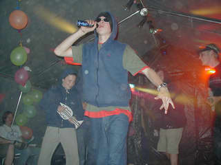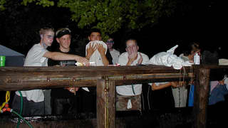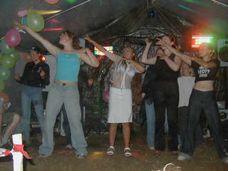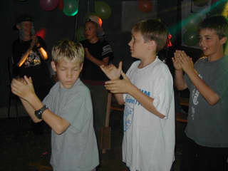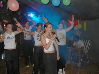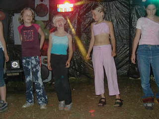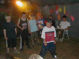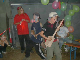 Mit einer Morgenwache zum Thema "Ich bin Ich und Du bist Du" begann der letzte Sonntag für die Teilnehmer. Nach gut 10 Tagen stand auch mal aufräumen und Zeltreinigung ganz hoch im Kurs. Die feuchten Klamotten wurden getrocknet. Mittags war die Vorbereitung für die Miniplaybackshow angesetzt, die abends dann von Oli und Franci moderiert wurde. Leider ging es heute sehr früh ins Bett, denn morgen fahren wir ins Phantasialand. Achtung lange Ladedauer ! ca. 130sec. bei 28.8 'er Modem | ||||||||||||||||||||