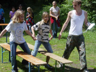 Aufgewacht sind die Teilnehmer heute durch einen kräftigen Gewitterschauer. Das erste Mal gab es Essen in der Regenvariante. Nun ist es aufgerissen und die Sonne scheint. Die Spassolympiade "Mr.Big" und das Geländespiel "Olympiade der Völker" beschäftigt die Teilnehmer. Abends ist dann im Kinopalast Harry Potter und Ice Age angesagt.