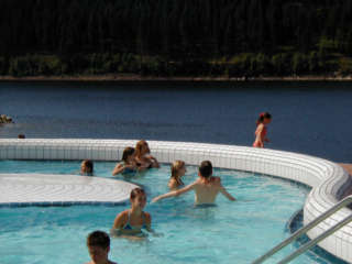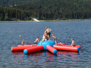 Schwimmbad- Aqua-fun im Schluchsee Kurz vor der Heimfahrt nutze das Zeltlager noch einmal das gute Wetter und fuhr in das nahe gelegene Schluchseefreibad Aqua Fun (um die verkrusteten Schmutzränder zu lösen - Witz) Das Naturfreibad bot alles an Möglichkeiten für die Kids. Schwimminsel, Rutschbahn, Schwimmbecken, ... Leider fiel ein Teil des Abschlussfestes ins Wasser. Neben frisch gegrillten Würsten gab es auch den berühmten Nudelsalat. Eine kleine Diashow mit ausgewählten Bildern der Freizeit und einer eye- toy-Ecke sollte das Programm abrunden. Aber leider waren dies die beiden einzigen Programmpunkte, da das Fest durch Regen beendet wurde. Aber dennoch blieb Zeit gemütlich Abschied zu nehmen