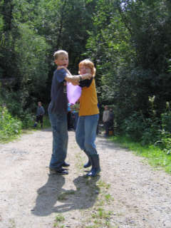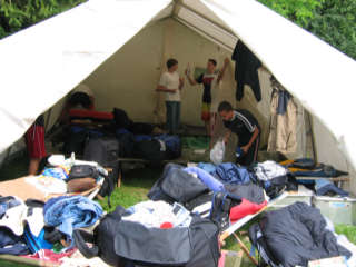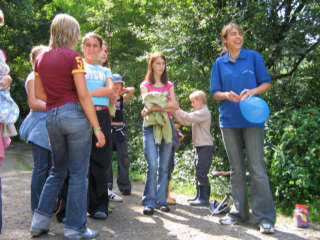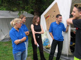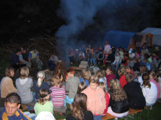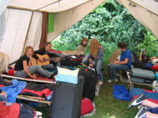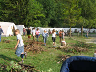 Kennen lernen, Zeltgestaltung und Lagerfeuerabend Am ersten Tag nach der anstrengenden Anreise, ging es um das Kennen lernen in den Zelten und das "häusliche Einrichten der Zelte. Bei einem Postenlauf mussten die Gruppen ihr Geschick u.a. in Teebeutelweitwurf, Luftballontanz, Montagsmaler, Pantomime u.s.w. unter Beweis stellen. Nachmittags ging es um die Zeltgestaltung. Ein Gedicht und Zeltname wurde ausgedacht, das Zelt so eingerichtet wie es die Gruppe will. Abends ging es ans Lagerfeuer mit Musik und Gruselgeschichte.