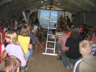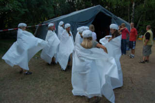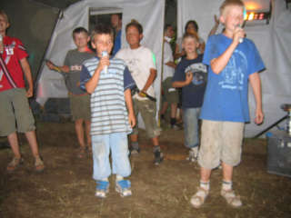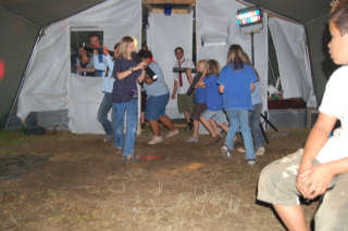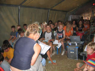 Ökumenische Morgenwache zum Thema Himmelsleiter und Miniplaybackshow Traditionell findet jeden Sonntag eine ökumenische Morgenwache im Zeltlager statt. Dieses Mal zum Thema der Geschichte Abrahams. Nachmittags hatte das ganze Lager was zu tun. Die traditionelle Miniplaybackshow stand an. Jedes Zelt hatte Vorbereitungen zu treffen, zu üben, zu bauen und zu entscheiden, welches Lied wohl das Beste sei. Abends bei der Show selbst jagte ein Höhepunkt den nächsten. Alle gaben nur das Beste und die Stimmung imGroßzelt "WALTER" war nahe des Siedepunktes. Gewinner wurden bei dieser Show, die Jungen aus Zelt Alex.