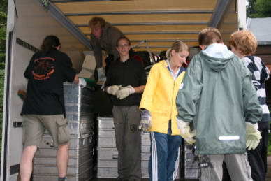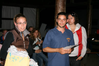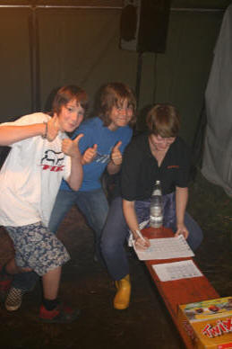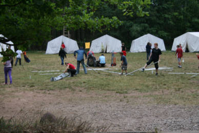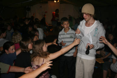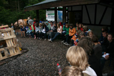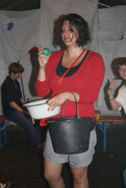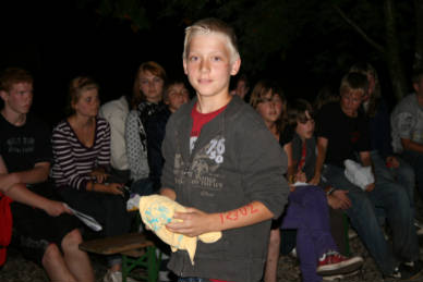 Abbau beginnt - Gummibären in Not Langsam beginnt der Abbau in Ludwigswinkel. Während einige Teamer Licht, Elektrik, Material und Küche abbauen spielen die Teilnehmer Bingo und nachmittags - als der Regen aufhört - Gummibärenbande in Not. "Es ist ein großes Chaos im Gummibärenwald ausgebrochen. Grammi hat keinen Gummibeerensaft mehr und muss dringend neuen kochen. Dafür sind aber viele verschiedene Gummibeeren notwendig, die allerdings erst noch gesammelt werden müssen. Das Problem dabei ist nur, dass Tummi alle Gummibeeren zu Hause aufgegessen hat. Die einzigen Gummibeeren die es noch gibt bewacht der böse Herzog Igthorn. Eure Aufgabe ist es nun Monster (Stationen) im Wald zu suchen und dort Aufgaben zu lösen. Es gibt folgende Monster-Stationen: Ø Monster Quack Ø Monster Isolde Ø Monster Erwin Ø Monster Drunhilde Ø Monster Waldemar Wenn ihr eine Aufgabe an den Stationen gelöst habt, bekommt ihr von dem Monster irgendeine beliebige Gummibeere. Es gibt 5 verschiedene Arten von Gummibären: blaue, rote, weiße, grüne und purpurrote. Um 1 Liter Gummibärensaft herzustellen benötigt ihr 7 Gummibeeren. Die Kombination wie viele Beeren ihr von jeder Sorte benötigt, wechselt alle 30min. Welche aktuelle Beerenkombination ihr für 1 Liter Saft benötigt, könnt ihr an der Hauptstation auf dem Zeltplatz erfahren." Abschluss des Zeltlagers am Lagerfeuer. Abgeschlossen hat das Zeltlagerprogramm mit einer traditionellen Gespenstergeschichte am Lagerfeuer. Vorher gab es noch für die letzten Spiele die Gewinner der Handtuchpunkte.