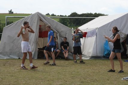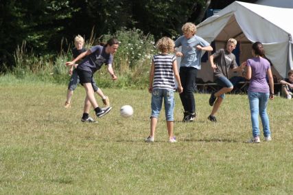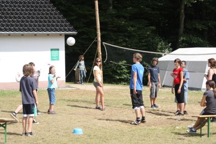 Dienstag ist Sporttag In fünf Disziplinen treten die Teilnehmer gegeneinander an. Fußball, Volleyball, menschlicher Basketballkorb, Seilspringen und Völkerball bringen die Zelte ins Schwitzen.