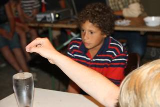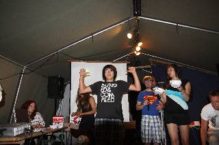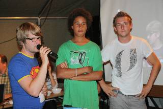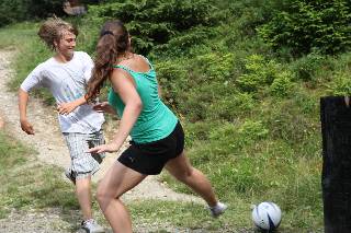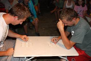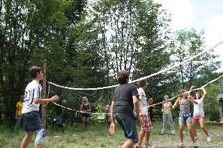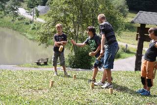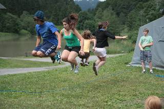 Sportliches am Dienstag: Sporttag und Schlag den Tobi Auf dem Platz wurden fünf Stadien neu erbaut. Das JRK Darmstadt und die Kommunale Jugendarbeit Groß-Gerau haben keine Koten und Mühen gescheut. Fünf weltklasse Schiedsrichter betreuten das Turnier in den Sportarten Brenn-, Fuß- und Volleyball, Wikingerschach und Seilhüpfen. Spannend wurde es am Abend. "Schlag den Tobi". Ein Spiel alle gegen den Teamer Tobi. In dem in Minispielen die Zelte gegen Tobi antreten konnten. In 11 Spielen wurde alles auf beiden Seiten gegeben. Letztendlich setzte sich Tobi mit sieben Punkten deutlich als Sieger ab.