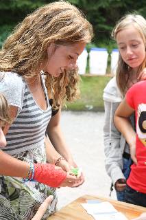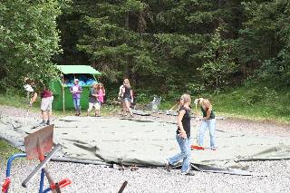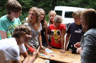 Die Siedler von Catan (unser Abbauspiel) Das Spiel Siedler basiert auf dem Brettspiel Siedler von Catan. Die Teilnehmer werden in ca. 10 Gruppen eingeteilt und pro Gruppe wird ein Baumeister ernannt, der an der Hauptstation bleibt. Die Hauptstation befindet sich an einem zentralen Ort auf dem Zeltplatz und hat ein großes Spielfeld. Im Wald sind 5 Stationen verteilt, die die Teilnehmer aufsuchen müssen, dort kleine Aufgaben lösen und für ihre erledigte Aufgabe an jeder Station einen Rohstoff (Holz, Lehm, Getreide, Schaf oder Erz) erhalten. Als Rohstoffe bekommen die Teilnehmer Rohstoffkarten, wo der Rohstoff mit einem Bild drauf abgebildet ist. Die Teilnehmer können natürlich untereinander die Rohstoffe auch tauschen. Mit den Rohstoffen müssen die Teilnehmer nun zu ihrem Baumeister an die Hauptstation zurück, der für seine Gruppe mit den Rohstoffen eine Siedlung, Straße, Stadt, Burg oder ein Ritter baut und sich um die stündlichen Steuereinnahmen für die gebauten Gebäude kümmert. Die Teilnehmer können beliebig viele Rohstoffe sammeln, bis sie an die Hauptstation zurückkehren und diese bei ihrem Baumeister abgeben. Ziel des Spieles ist es also an den verschiedenen Stationen Rohstoffe zu bekommen und mit diesen Rohstoffen an der Hauptstation zu bauen. Die Rohstoffkombination, um beispielsweise eine Straße zu bauen, bleibt immer gleich, allerdings wechseln an den Stationen alle 15min. die Rohstoffe. Auch auf dem Zeltplatz gibt es Rohstoffe gegen Leistung. Das Helfen beim Abbau wird also belohnt. Kisten tragen, Zelte abbauen oder andere Tätigkeiten zahlen sich in wichtigen Rohstoffen aus die zum Sieg beitragen können.