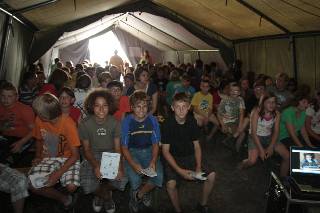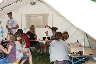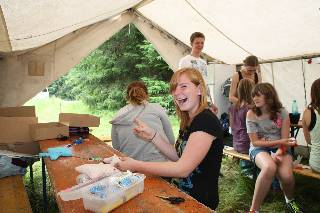 Morgenwache und Projekttag In der Morgenwache setzten sich die Teilnehmer mit dem Buch "Katrin spricht mit den Augen" auseinander. Aufgearbeitet wurde die Problematik dass Kinder ohne Sprache nicht so einfach kommunizieren können und die mit Hilfe einer Buchstabentafel dieses Handicap überbrücken. Üben konnten die Teilnehmer mit "Katrins Buchstabetafel". Etwas ungewohnt aber erfahrungsreich. Nach dem Mittagessen startete der Projekttag unter dem Motto "Für jeden etwas dabei". Von diversen Bastelangeboten (Regenmachern, Flaschengärten, Raumteilern,...) über Geochaching, Volleyball, Fußball bis hin zu Thomas Tea Party (Englische Sprachanimation). Etwas überschattet war der Tag allerdings durch den Regen, der Nachmittags das Programm durcheinander wirbelte.