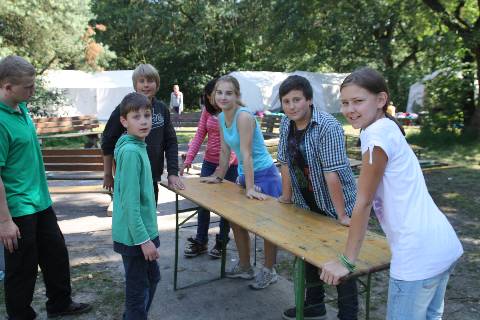 Die Siedler von Catan und der erste Teil des Abbaus Mit dem Strategiegeländeabbauspiel "Die Siedler von Catan" wird das Ende der Freizeit eingeläutet. Die "Siedler" müssen Rohstoffe ergattern um entsprechende Siedlungen, Strassen, Städte usw. zu bauen. Integriert in den Abbau kommt das Spiel gut an. Hier können auch die letzten Punkte für die begehrten T-Shirts gewonnen werden. Am Abschiedslagerfeuer werden die Shirts verteilt.