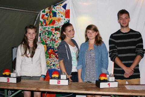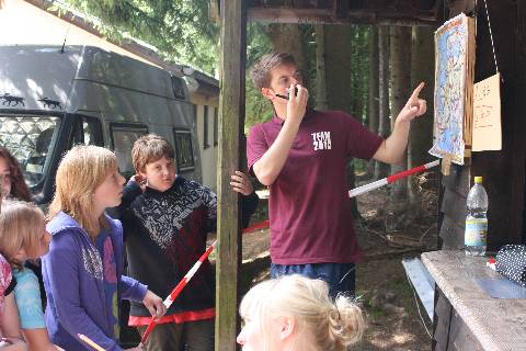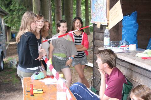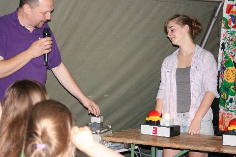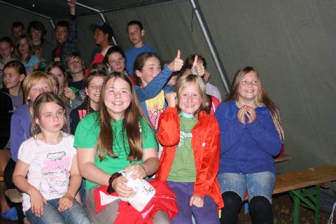 Zug um Zug Das Tagesgeländespiel Zug um Zug brachte die Teilnehmer in das Land der Eisenbahnbauer. Strecken auf dem gesamten Kontinent sind zu bauen. Dafür mussten die Spieler Ihr Wissen unter Beweis stellen. Wichtige geschichtliche Ereignisse wurden an den Stationen in die richtige chronologische Reihenfolge gebracht, dafür gab es Streckenkarten. Für den richtigen Bau der Strecken waren Bahnoberinspektorin Annina und Oberinspektor Johannes verantwortlich. Am Abend war eine Neuauflage der Great Buzzer Show.. Gespielt wurde um Zeit und Wissen. Sieger an diesem Abend wurde das Zelt Katharina.